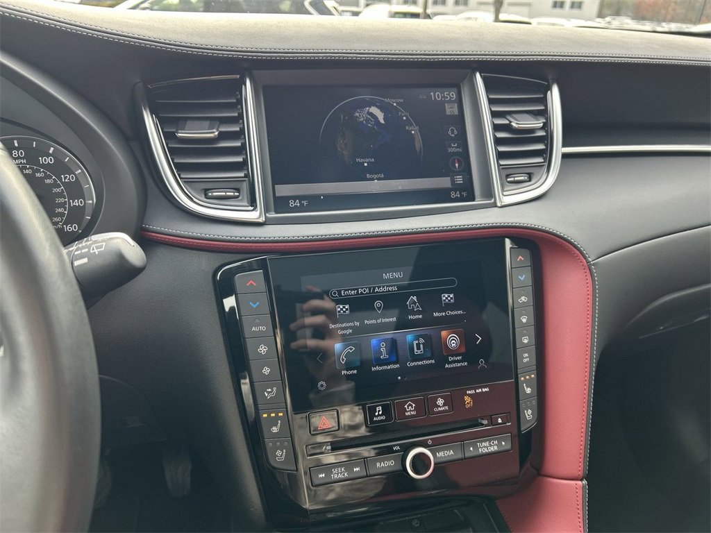 INFINITI Certified Pre-Owned Certified, 12 Speakers, 4-Wheel Disc Brakes, 5.846 Axle Ratio, ABS brakes, Air Conditioning, Alloy wheels, AM/FM radio: SiriusXM, Auto High-beam Headlights, Auto-dimming Rear-View mirror, Automatic temperature control, Bose Premium Audio System, Brake assist, Bumpers: body-color, CD player, Climate Controlled Front Bucket Seats, Delay-off headlights, Driver door bin, Driver vanity mirror, Dual front impact airbags, Dual front side impact airbags, Electronic Stability Control, Emergency communication system: INFINITI InTouch (1-year complimentary trial), Floor Mats, Four wheel independent suspension, Front anti-roll bar, Front Bucket Seats, Front Center Armrest, Front dual zone A/C, Front fog lights, Front reading lights, Fully automatic headlights, Garage door transmitter: HomeLink, Heated door mirrors, Heated front seats, Heated steering wheel, Illuminated entry, Illuminated Kick Plates, Knee airbag, Leather Shift Knob, Leather steering wheel, Literature Kit, Low tire pressure warning, Memory seat, Navigation system: INFINITI InTouch Navigation, Occupant sensing airbag, Outside temperature display, Overhead airbag, Overhead console, Panic alarm, Passenger door bin, Passenger vanity mirror, Power door mirrors, Power driver seat, Power Liftgate, Power moonroof, Power passenger seat, Power steering, Power windows, Radio data system, Rear anti-roll bar, Rear reading lights, Rear seat center armrest, Rear side impact airbag, Rear window defroster, Rear window wiper, Remote keyless entry, Security system, Semi-Aniline Leather-Appointed Seat Trim, Speed control, Speed-sensing steering, Speed-Sensitive Wipers, Splash Guards (Set of 4), Split folding rear seat, Spoiler, Steering wheel mounted audio controls, Tachometer, Telescoping steering wheel, Tilt steering wheel, Traction control, Trip computer, Turn signal indicator mirrors, Variably intermittent wipers, Ventilated front seats, Wheels: 20" Black Painted Machine Finished.