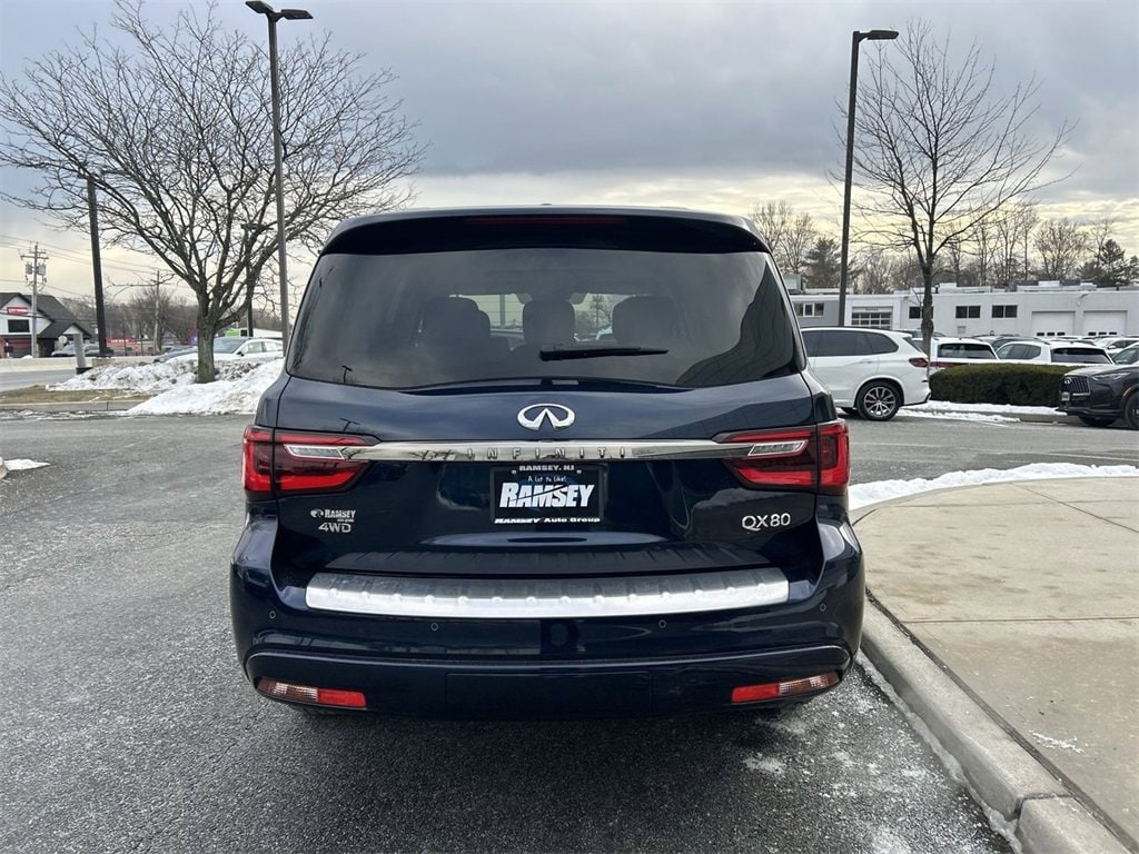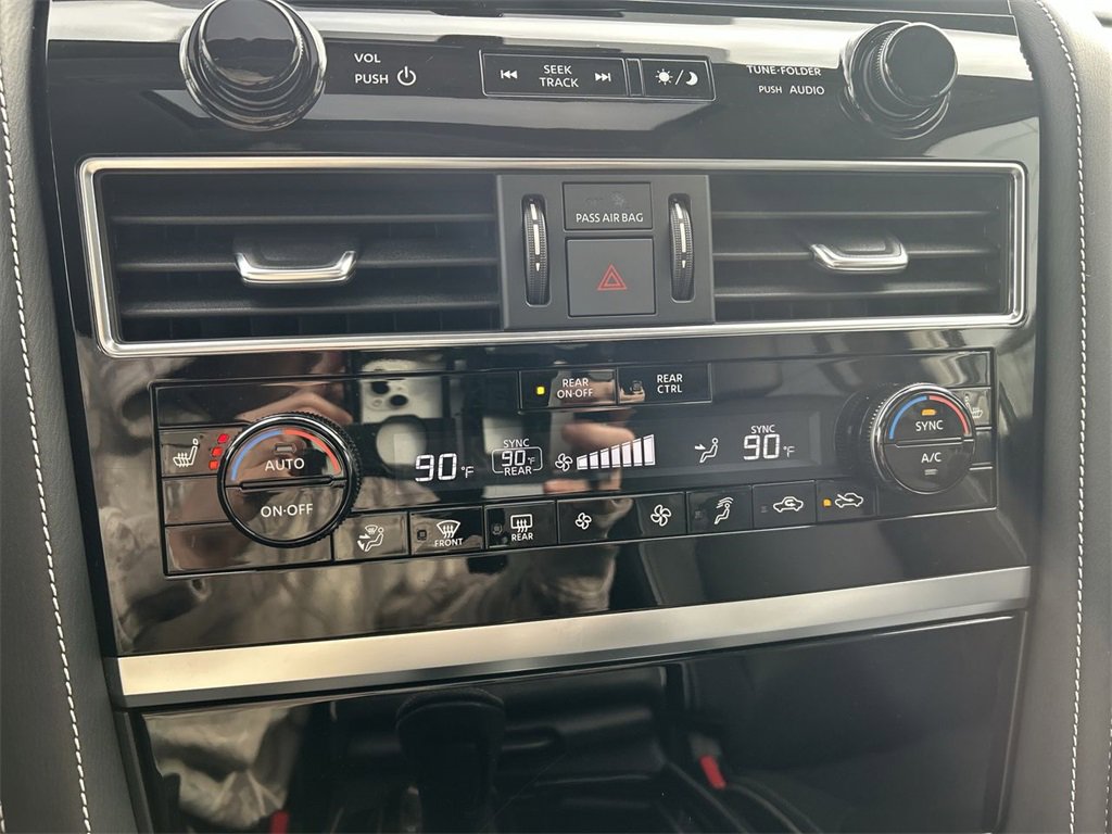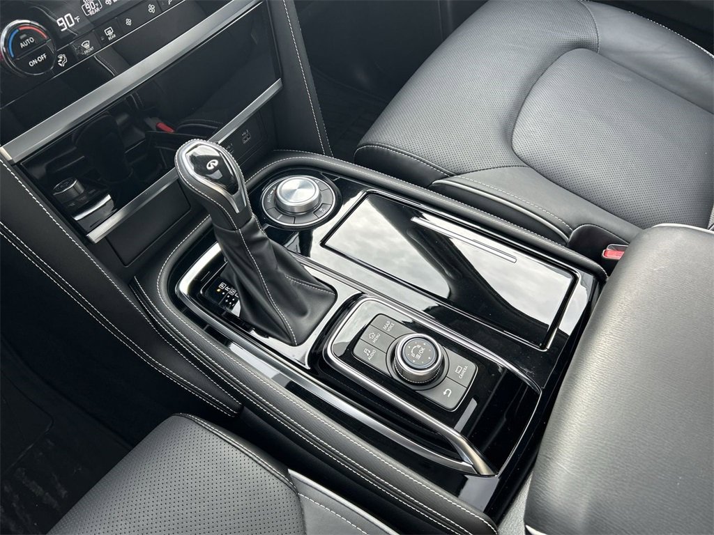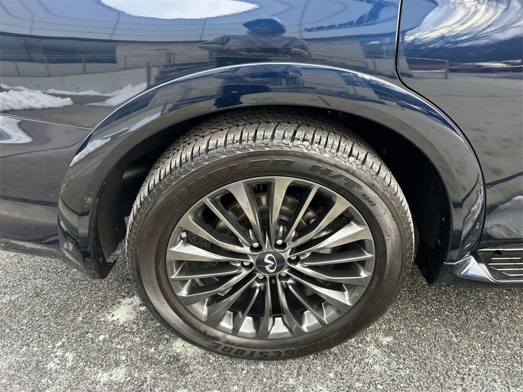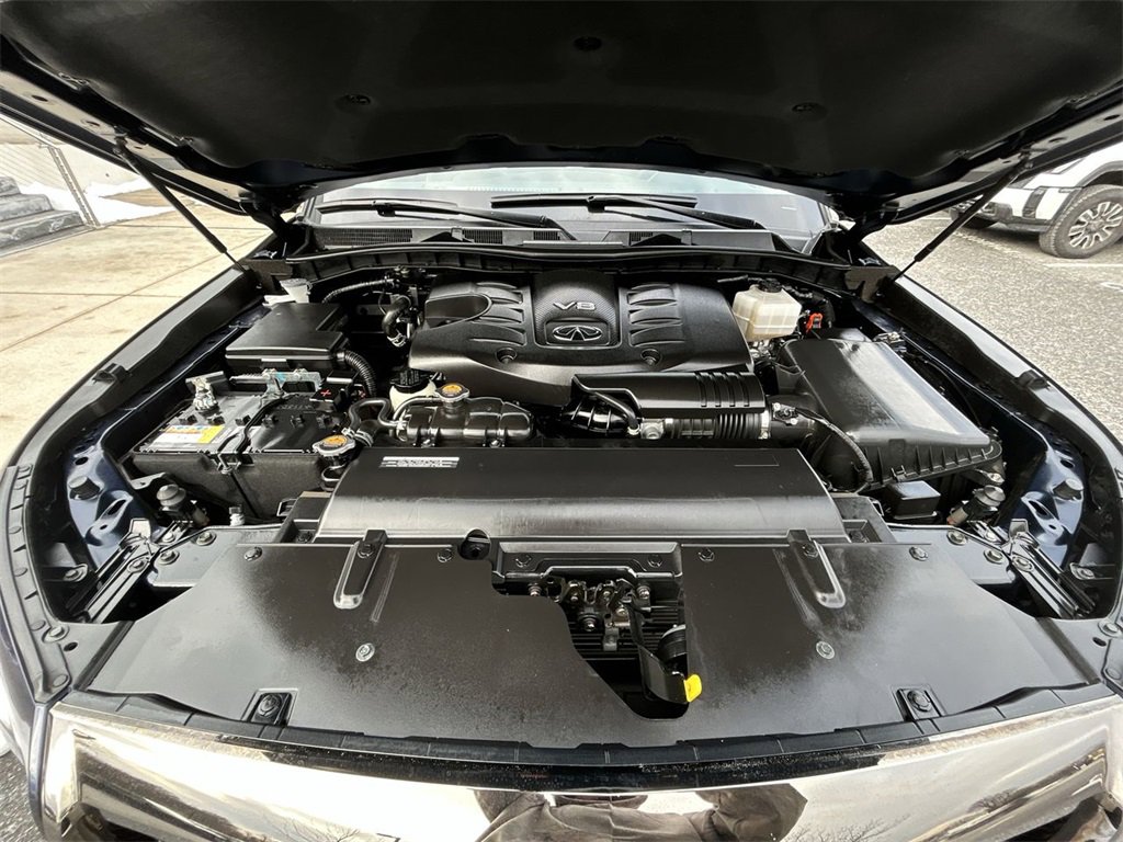 INFINITI Certified Pre-Owned Certified, 13 Speakers, 2.937 Axle Ratio, 3rd row seats: bench, 4-Wheel Disc Brakes, ABS brakes, Air Conditioning, Alloy wheels, AM/FM radio: SiriusXM, Anti-whiplash front head restraints, Apple CarPlay/Android Auto, Auto High-beam Headlights, Auto tilt-away steering wheel, Auto-dimming door mirrors, Auto-dimming Rear-View mirror, Auto-leveling suspension, Automatic temperature control, Brake assist, Bumpers: body-color, Cargo Package, Compass, Console Net, Delay-off headlights, Driver door bin, Driver vanity mirror, Dual front impact airbags, Dual front side impact airbags, Electronic Stability Control, Emergency communication system: INFINITI InTouch, First-Aid Kit, Four wheel independent suspension, Front anti-roll bar, Front Bucket Seats, Front Center Armrest, Front dual zone A/C, Front fog lights, Front reading lights, Fully automatic headlights, Garage door transmitter: HomeLink, Heated door mirrors, Heated Front Bucket Seats, Heated front seats, Heated steering wheel, Illuminated entry, Leather Shift Knob, Leather steering wheel, Leather-Appointed Seats, Literature Kit, Low tire pressure warning, Memory seat, Moisture-Resistant Rear Cargo Carpet, Navigation system: INFINITI InTouch Navigation, Nylon-Cord Cargo Net, Occupant sensing airbag, Outside temperature display, Overhead airbag, Overhead console, Panic alarm, Passenger door bin, Passenger vanity mirror, Power door mirrors, Power driver seat, Power Liftgate, Power moonroof, Power passenger seat, Power steering, Power windows, Premium Select Graphite Interior, Radio data system, Radio: Bose Premium Audio System w/13 Speakers, Rain sensing wipers, Rear air conditioning, Rear anti-roll bar, Rear reading lights, Rear seat center armrest, Rear window defroster, Rear window wiper, Reclining 3rd row seat, Remote keyless entry, Roof Rail Cross Bars, Security system, Speed control, Speed-sensing steering, Split Bench Seat Package, Split folding rear seat, Spoiler, Steering wheel memory, Steering wheel mounted audio controls, Tachometer, Telescoping steering wheel, Tilt steering wheel, Traction control, Trip computer, Turn signal indicator mirrors, Variably intermittent wipers, Voltmeter, Wheels: 22" Dark Chrome Cast Aluminum-Alloy.